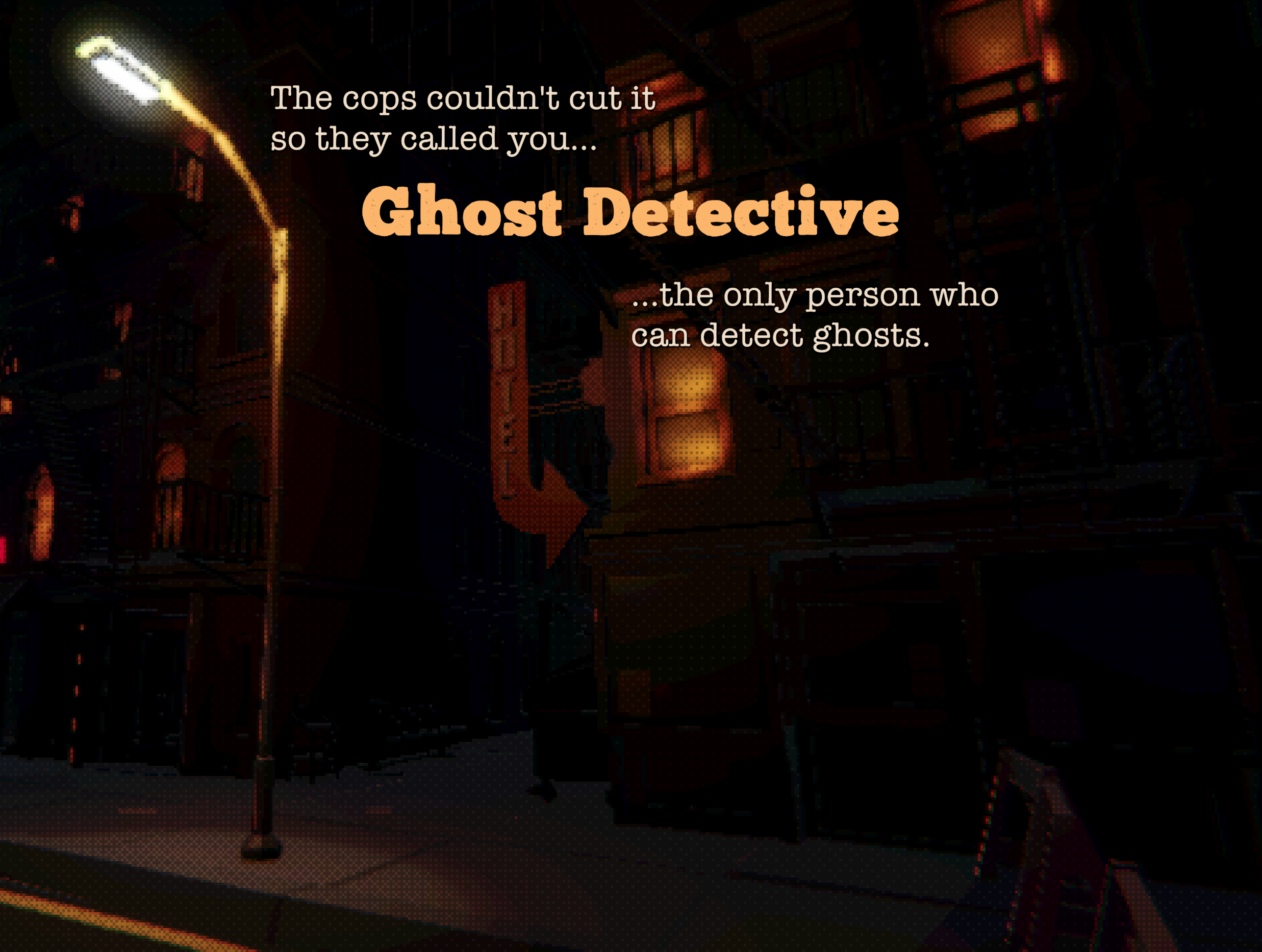 At its core, "The cops couldn't cut it so they called you... GHOST DETECTIVE... the only person who can detect ghosts" is about family. Mostly it is about the ghosts but just think about family okay? Well, okay, it's also about you, the Detective (who can detect ghosts , yes yes) and your ridiculous flashlight (lore coming in lore update). You were called in to investigate some gosh dang ghosts in this gosh dang city and you're the only one who can do it.